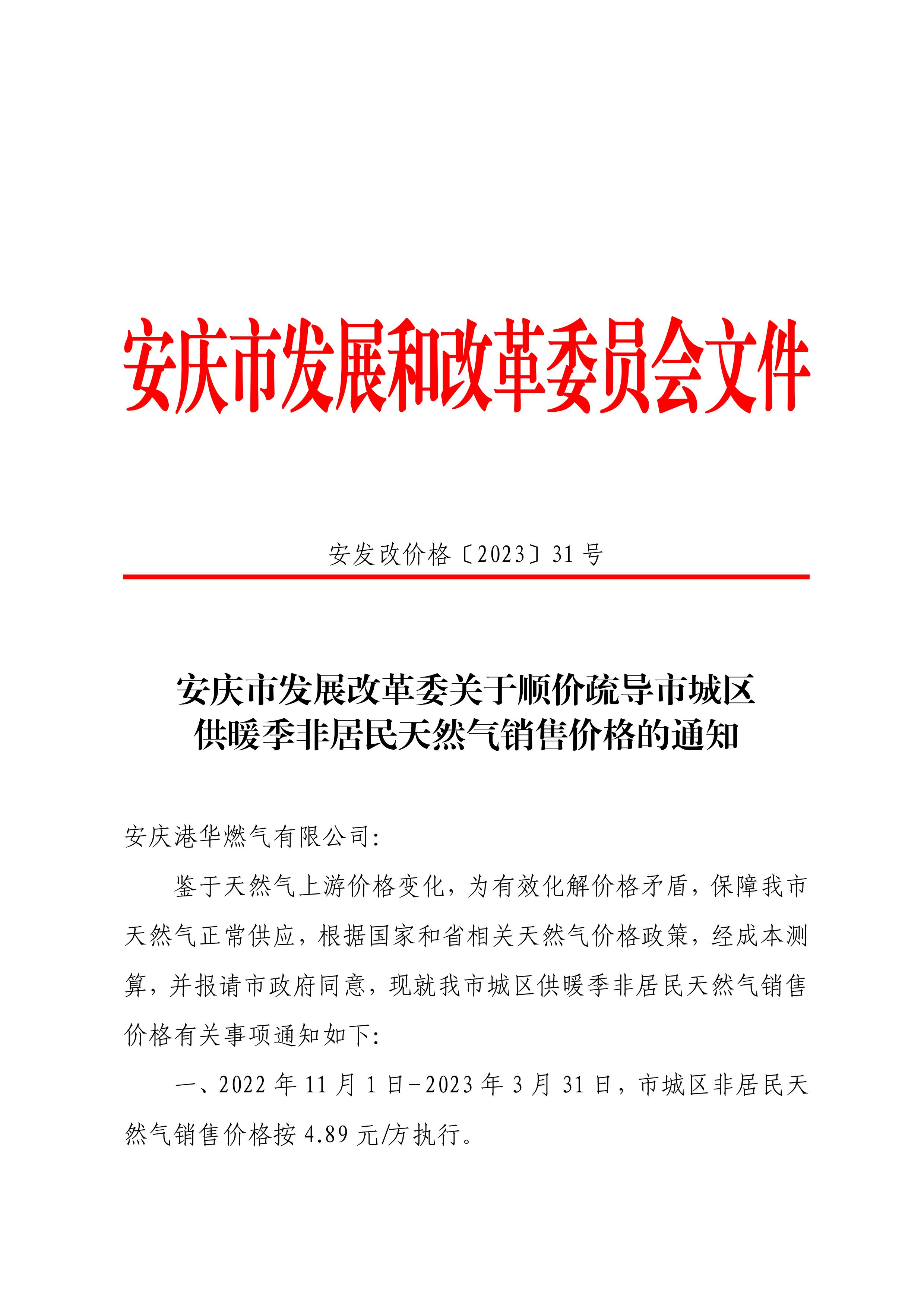 關(guān)于順價(jià)疏導(dǎo)市城區(qū)供暖季非居民天然氣銷售價(jià)格的通知