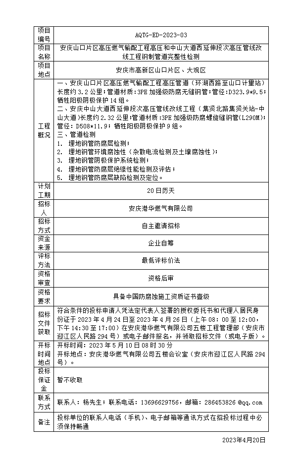 安慶山口片區(qū)高壓燃氣輸配工程高壓和中山大道西延伸段次高壓管線改線工程鋼制管道完整性檢測招標公告 發(fā)布時間:2023-04-24    閱讀次數(shù):3394次