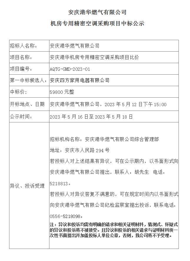 安慶港華燃?xì)庥邢薰緳C(jī)房專用精密空調(diào)采購項(xiàng)目中標(biāo)公示