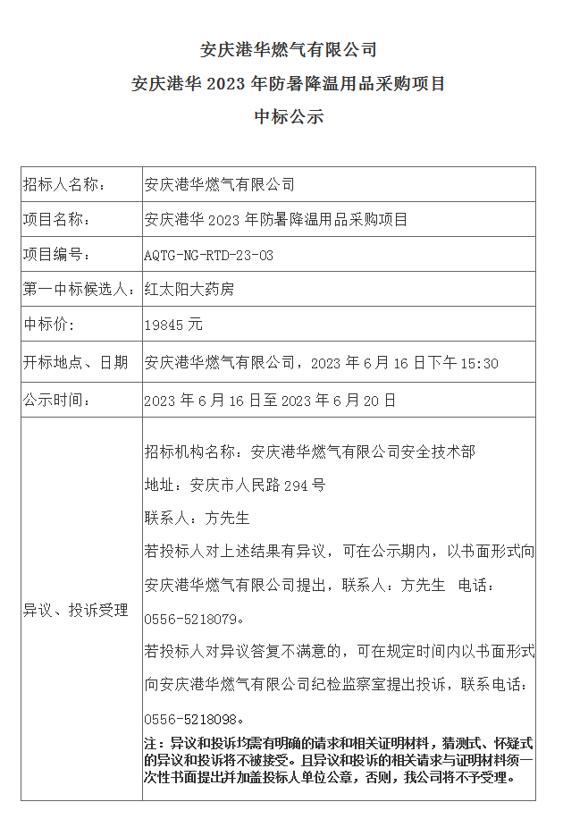 安慶港華燃?xì)庥邢薰?023年防暑降溫用品采購項(xiàng)目中標(biāo)公示