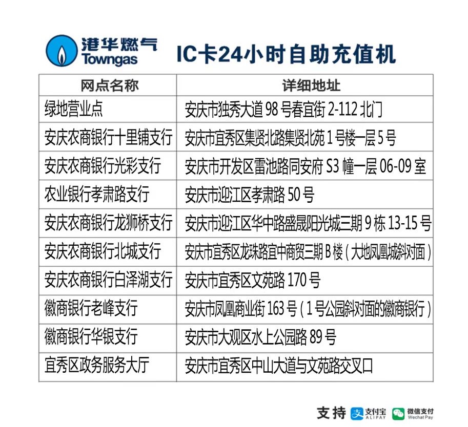 目前我公司支持交通銀行、徽商銀行、郵政儲蓄銀行、工商銀行、農(nóng)業(yè)銀行和浦發(fā)銀行的網(wǎng)上銀行和手機銀行,以及移動“中國移動”、電信“翼支付”、我公司微信公眾號和在“微信”-“生活繳費”、“支付寶”-“生活繳費”中查詢?nèi)細赓M并繳納欠費或預(yù)存氣費。