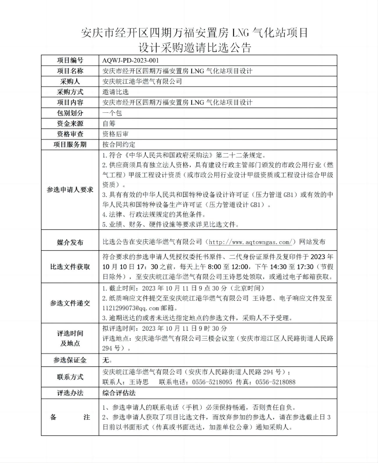 安慶市經開區(qū)四期萬福安置房LNG氣化站項目 設計采購邀請比選公告
