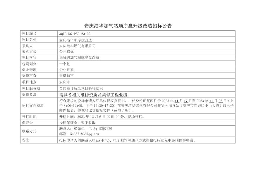 安慶港華加氣站順序盤改造項(xiàng)目招標(biāo)公告 發(fā)布時間:2023-11-17    閱讀次數(shù):3137次