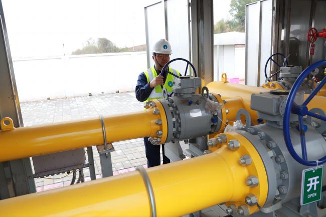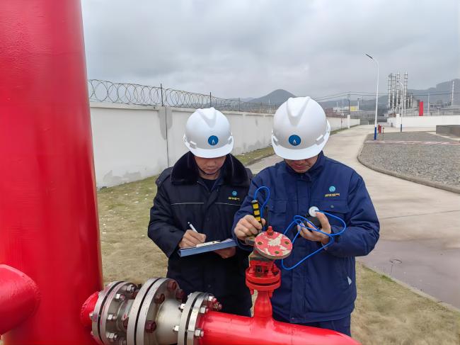 12時(shí)08分,置換作業(yè)開(kāi)始。確定管道內(nèi)氣體成分比例符合要求后,置換組緩慢開(kāi)啟1號(hào)閥門(mén),向管網(wǎng)內(nèi)輸送天然氣,并由調(diào)度中心對(duì)管網(wǎng)內(nèi)壓力情況跟進(jìn)、監(jiān)測(cè)。正午時(shí)分,驕陽(yáng)似火,檢測(cè)人員們一邊吃著盒飯一邊堅(jiān)守施工現(xiàn)場(chǎng)觀測(cè)數(shù)據(jù)。終于,14時(shí)16分,現(xiàn)場(chǎng)調(diào)度的對(duì)講機(jī)內(nèi)傳來(lái)放散塔檢測(cè)人員的聲音:“經(jīng)檢測(cè),管網(wǎng)內(nèi)燃?xì)夂恳堰_(dá)99.7%,置換合格。”