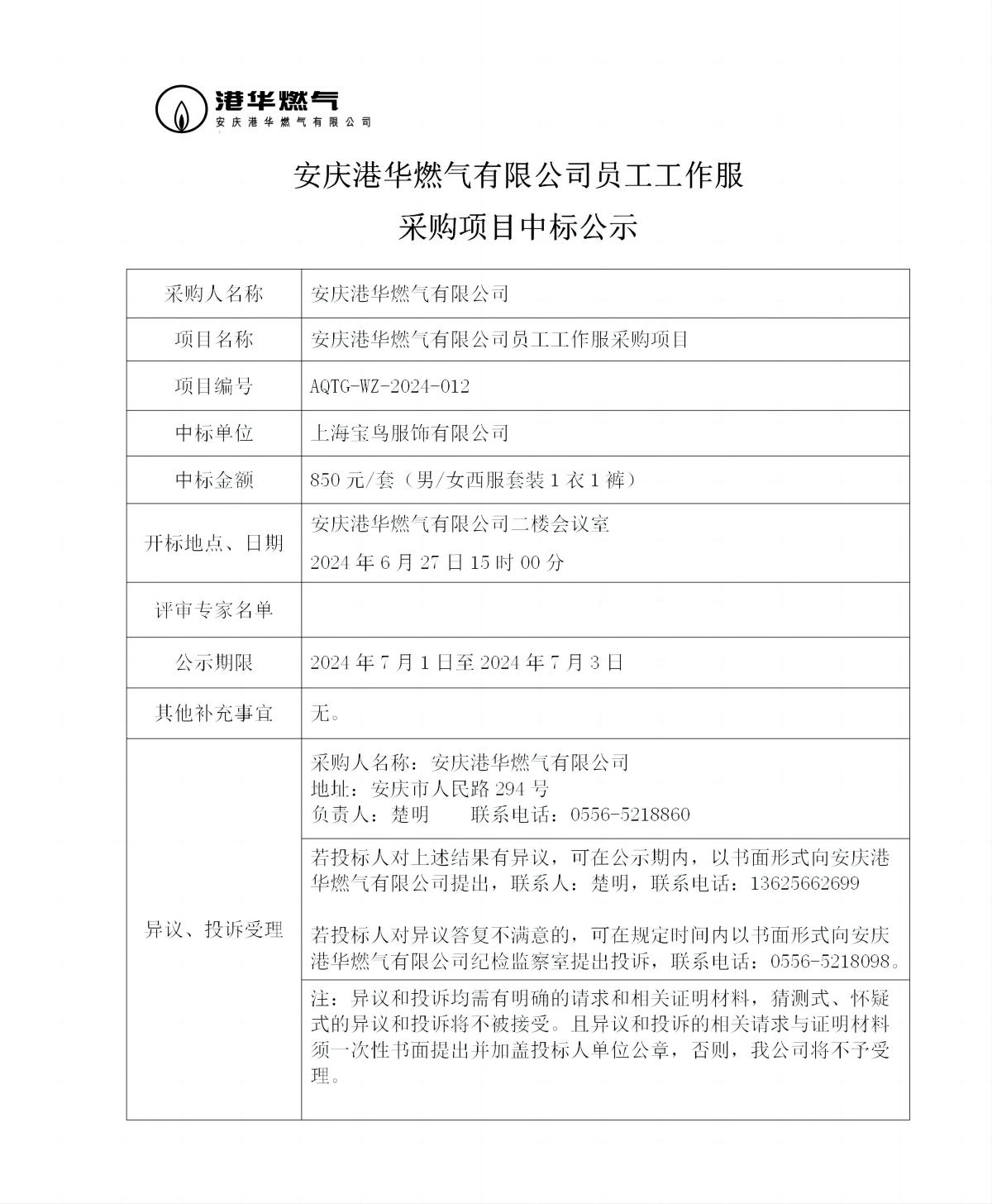 安慶港華燃?xì)庥邢薰締T工工作服采購項(xiàng)目中標(biāo)公示