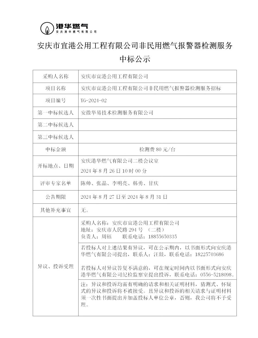 安慶市宜港公用工程有限公司非民用燃?xì)鈭?bào)警器檢測(cè)服務(wù)中標(biāo)公示