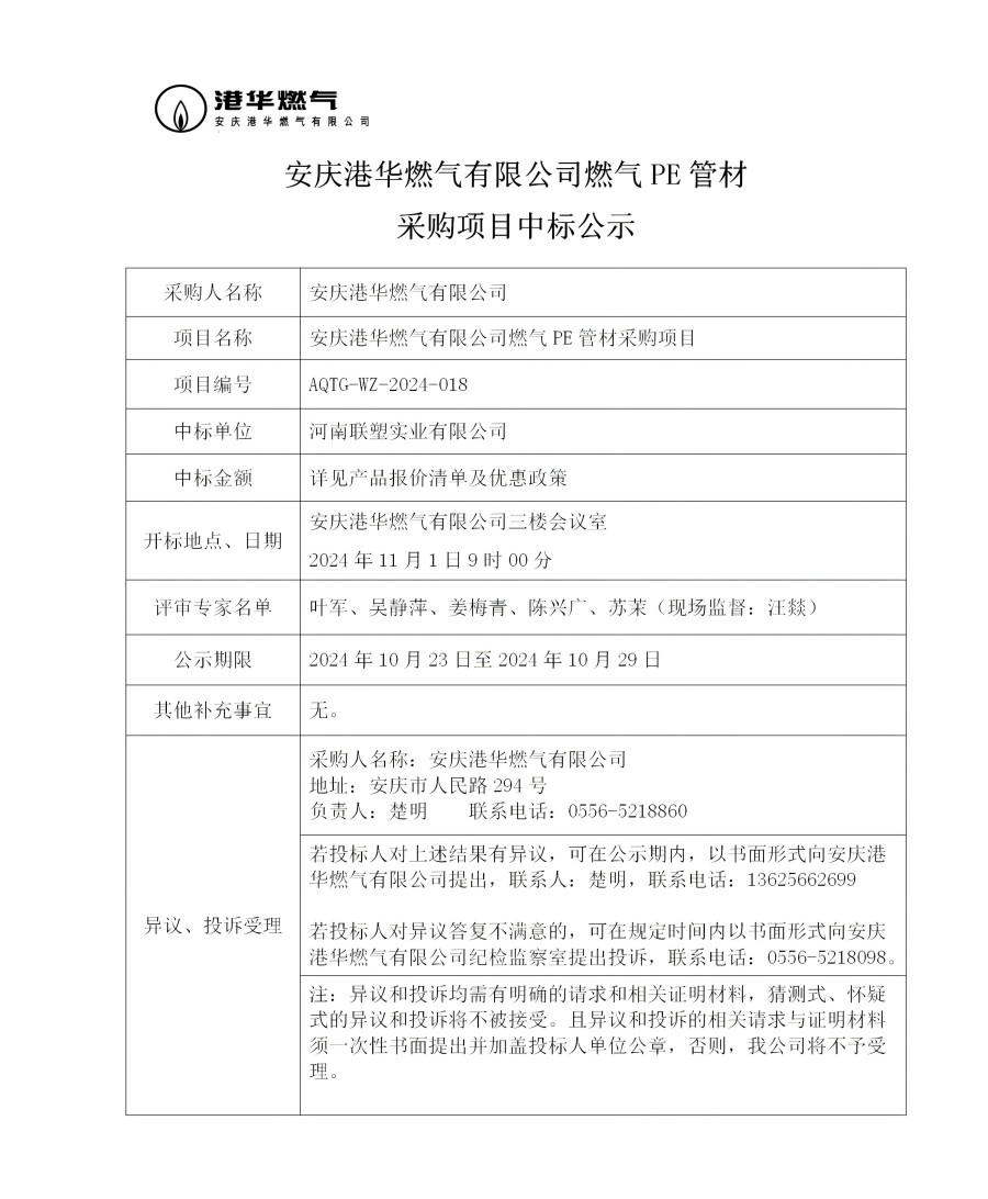 安慶港華燃氣有限公司燃氣PE管材采購項目中標公示