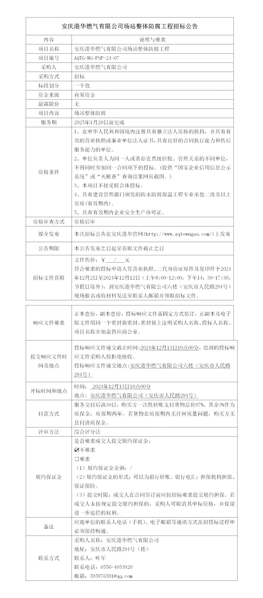 安慶港華燃氣有限公司場站整體防腐工程招標公告 發(fā)布時間:2024-11-30    閱讀次數(shù):3087次