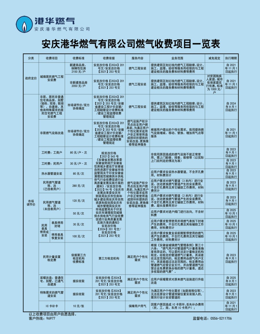 安慶港華燃?xì)庥邢薰臼召M(fèi)項(xiàng)目一覽表(2025)