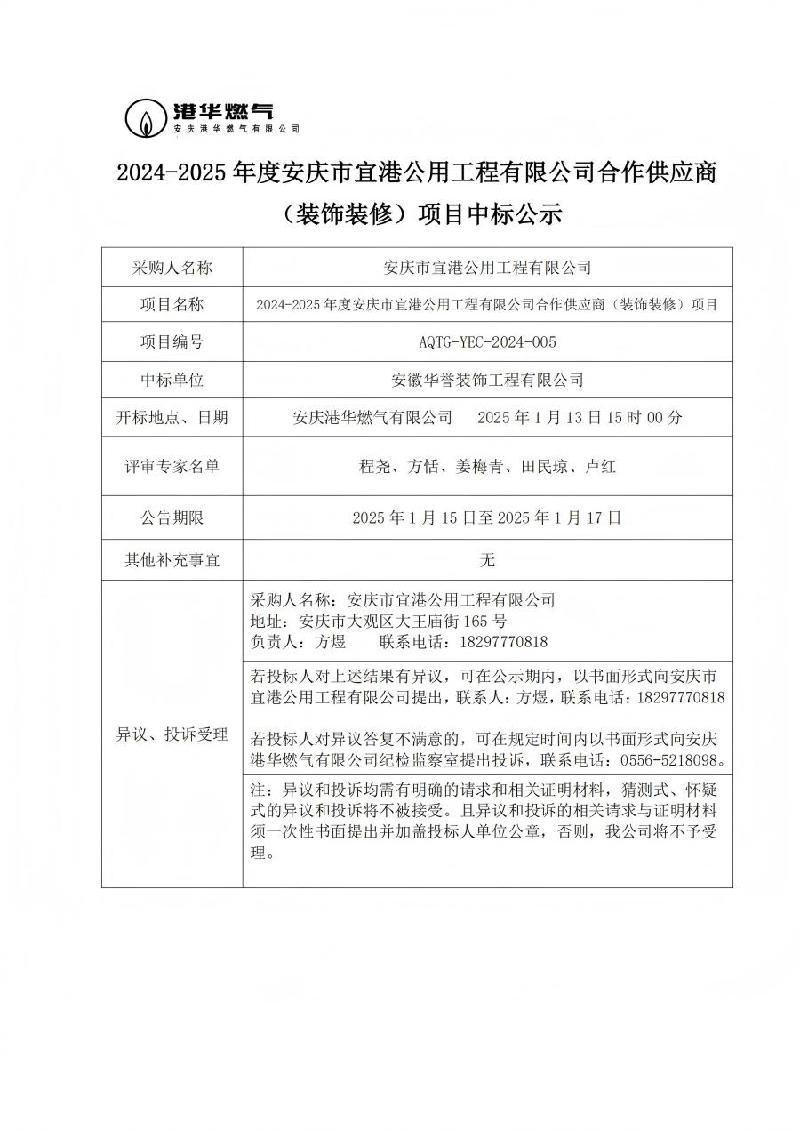 2024-2025 年度安慶市宜港公用工程有限公司合作供應(yīng)商 (裝飾裝修)項(xiàng)目中標(biāo)公示 發(fā)布時(shí)間:2025-01-15    閱讀次數(shù):2509次
