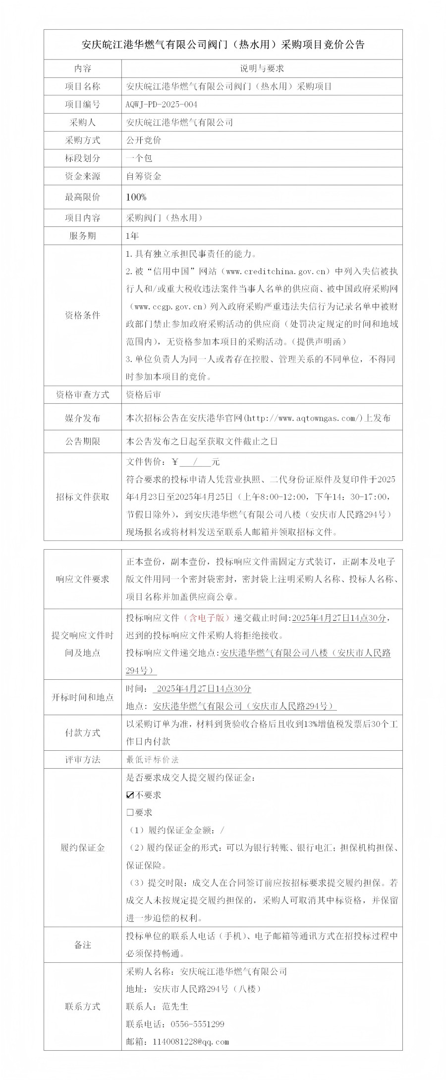 安慶皖江港華燃?xì)庥邢薰鹃y門(mén)(熱水用)采購(gòu)項(xiàng)目競(jìng)價(jià)公告