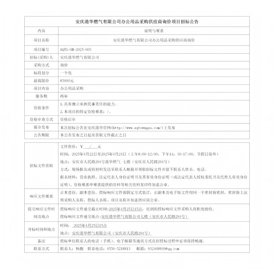 安慶港華燃?xì)庥邢薰巨k公用品采購(gòu)供應(yīng)商詢價(jià)項(xiàng)目招標(biāo)公告