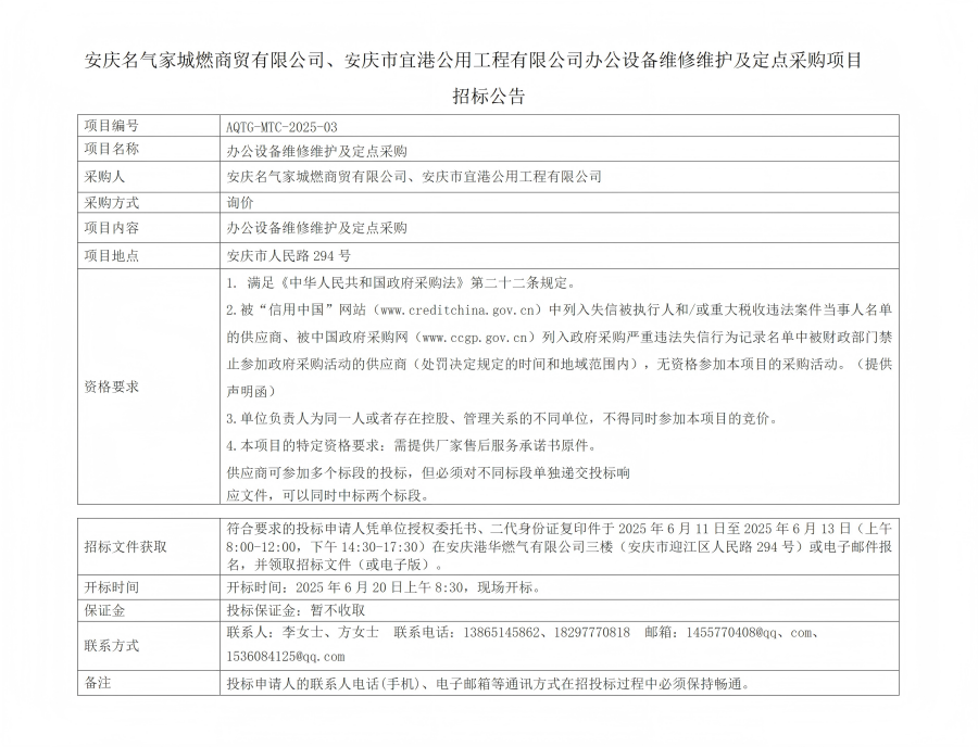 安慶名氣家城燃商貿(mào)有限公司、安慶市宜港公用工程有限公司辦公設備維修維護及定點采購招標公告 發(fā)布時間:2025-06-11    閱讀次數(shù):1560次