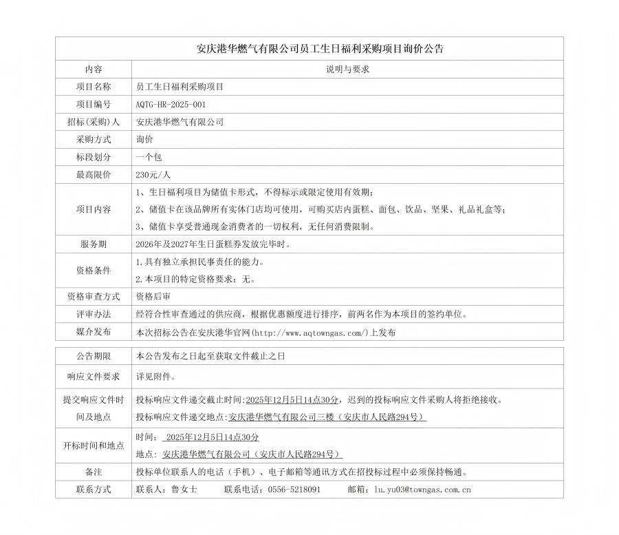 安慶港華燃氣有限公司員工生日福利采購項目詢價公告 發(fā)布時間:2025-11-28    閱讀次數(shù):848次