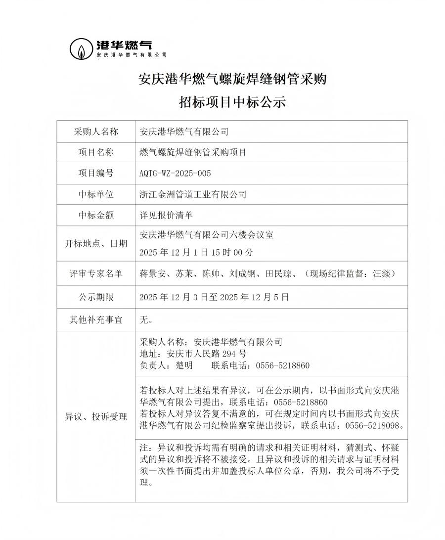 安慶港華燃?xì)饴菪缚p鋼管采購招標(biāo)項(xiàng)目中標(biāo)公示 發(fā)布時(shí)間:2025-12-03    閱讀次數(shù):705次