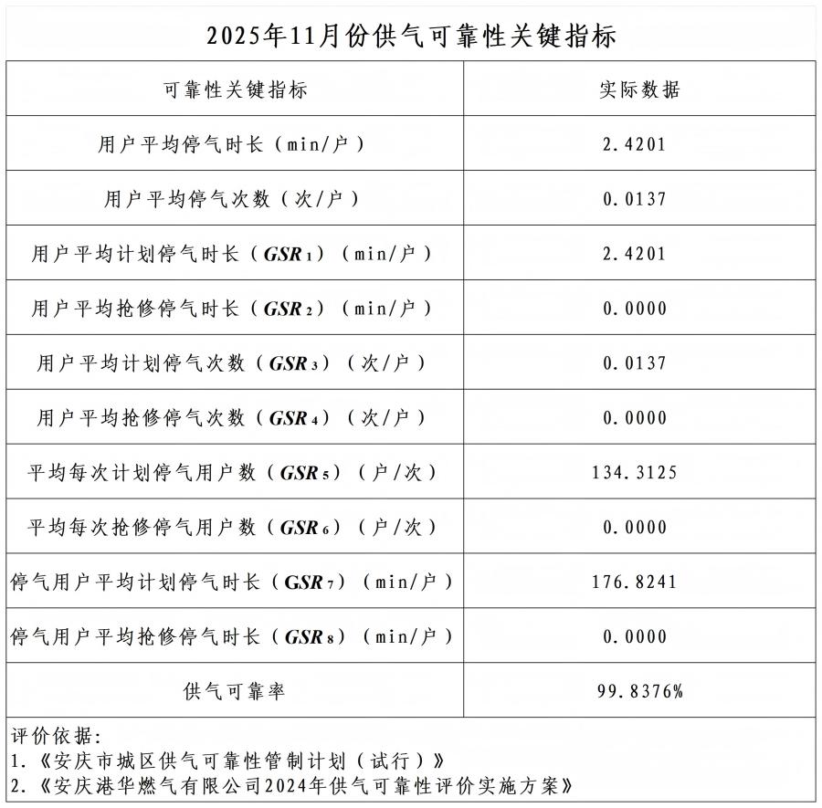 2025年11月份供氣可靠性關鍵指標